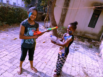 I woke up in the early morning and heard the babble of boys through an opened window of my room, saw them running with a bottle of watercolour. Crying aloud, whispering in ears, going secretly behind the back and throwing a bucket of water or with a sprinkler machine. I came out and glared at those happy faces. I remember it was at morning 9 am, my wife came out and saw me standing on the road and watching them with a camera in my hand. I was smiling at them to click a perfect picture.